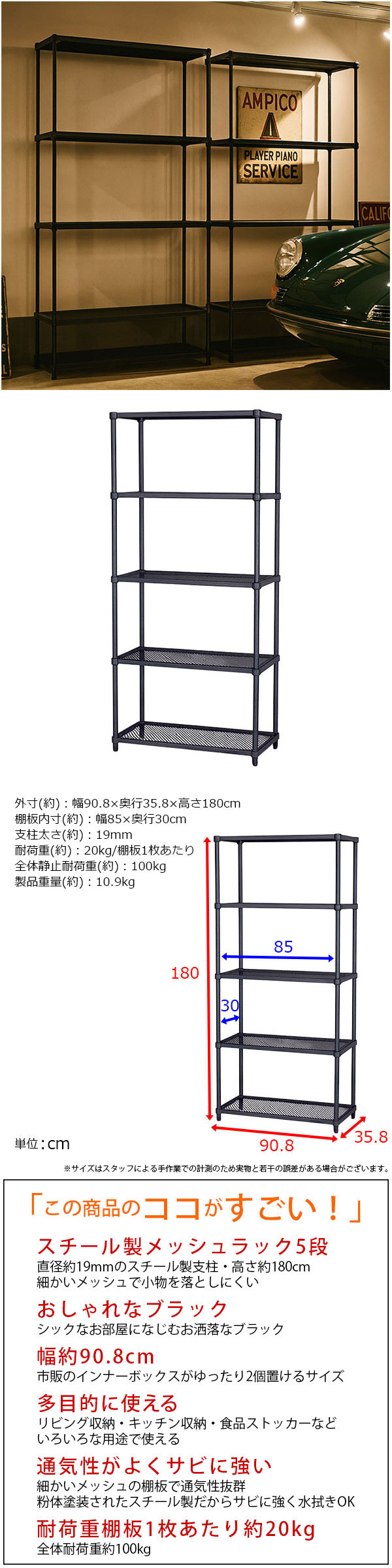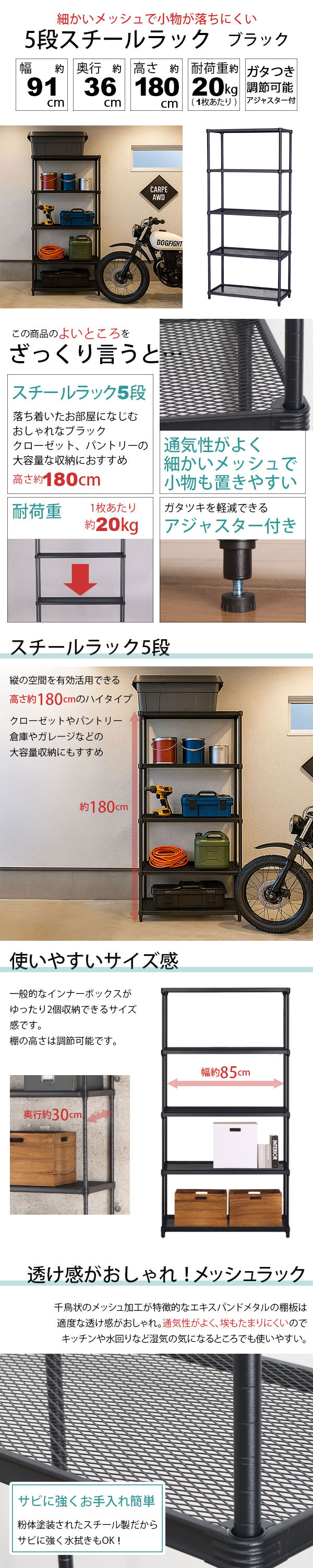 幅約91cm 奥行約36cm 高さ約180cm 耐荷重約20kg(1枚あたり)ガタつき調節可能アジャスター付