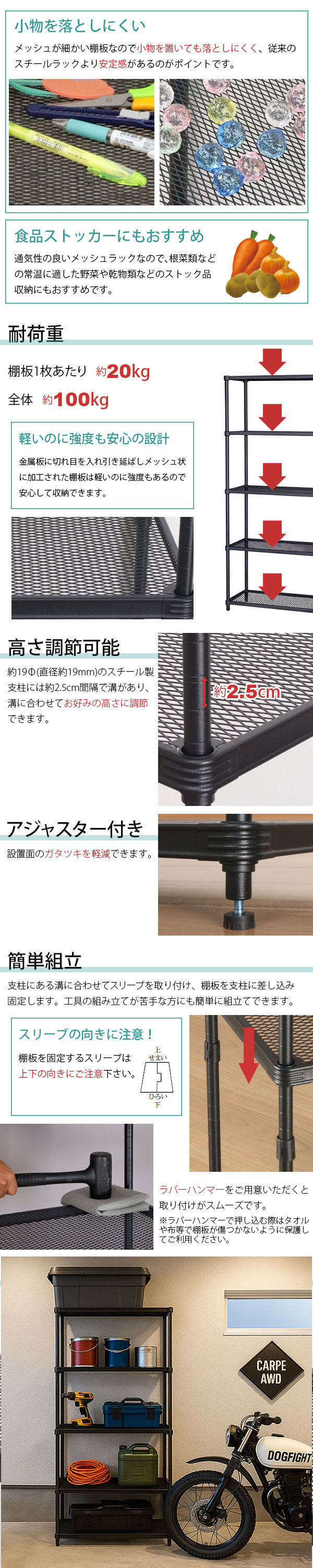 物が落ちにくい! メッシュラック の説明