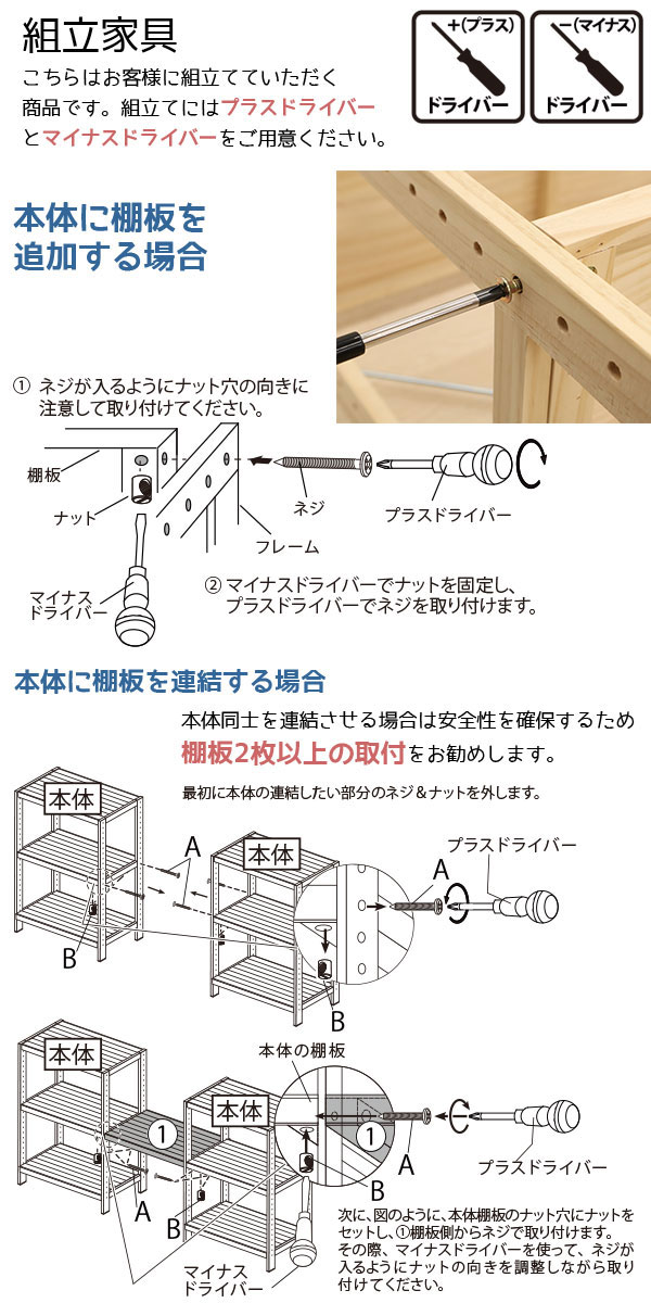 こちらはお客様に組立てていただく商品です。組立てにはプラスドライバーとマイナスドライバーをご用意ください。