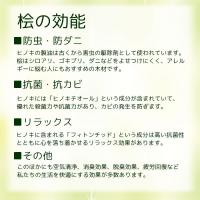 | ・届いたらすぐ使える完成品家具です。 ・天然木を使用しているため、自然な風合いをお楽しみいただけます。 ・桧には抗菌&抗カビ効果、防虫&防ダニ効果があり、いつまでも清潔にお使いいただけます。 ・また桧にはリラックス効果があり、その他にも空気清浄、脱臭効果、疲労回復などの生活を快適にする効果が多数あります。 ※こちらの商品は天然木を使用しているため、木目・節目・色合いなどに個体差がありますが、これらは天然木特有の風合いであり不良品ではございません。予めご了承くださいませ。 |