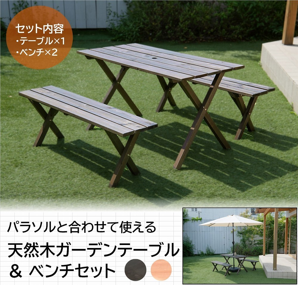 【キーワード】ガーデンテーブルセット 木製 天然木 テーブル ベンチ おしゃれ 庭 テラス 組立 組立式 DIY バーベキュー BBQ ホームパーティー パラソル対応 ブラウン ナチュラル 3点セット カフェテラス ガーデンファニチャー ホームパーティー 雨ざらし 憩いの場 休憩スペース