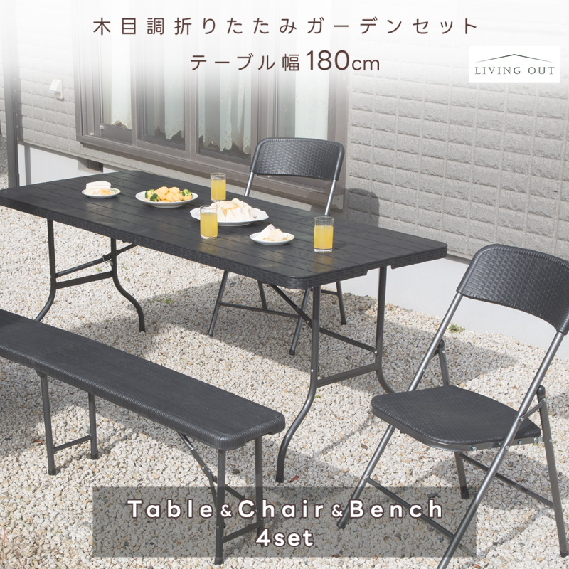 折りたたみテーブル チェア ベンチ 4点セット ガーデニング アウトドア 簡易 作業台 ガーデン お庭 家具 木目 ラタン調 防サビ 屋外 コンパクト 収納