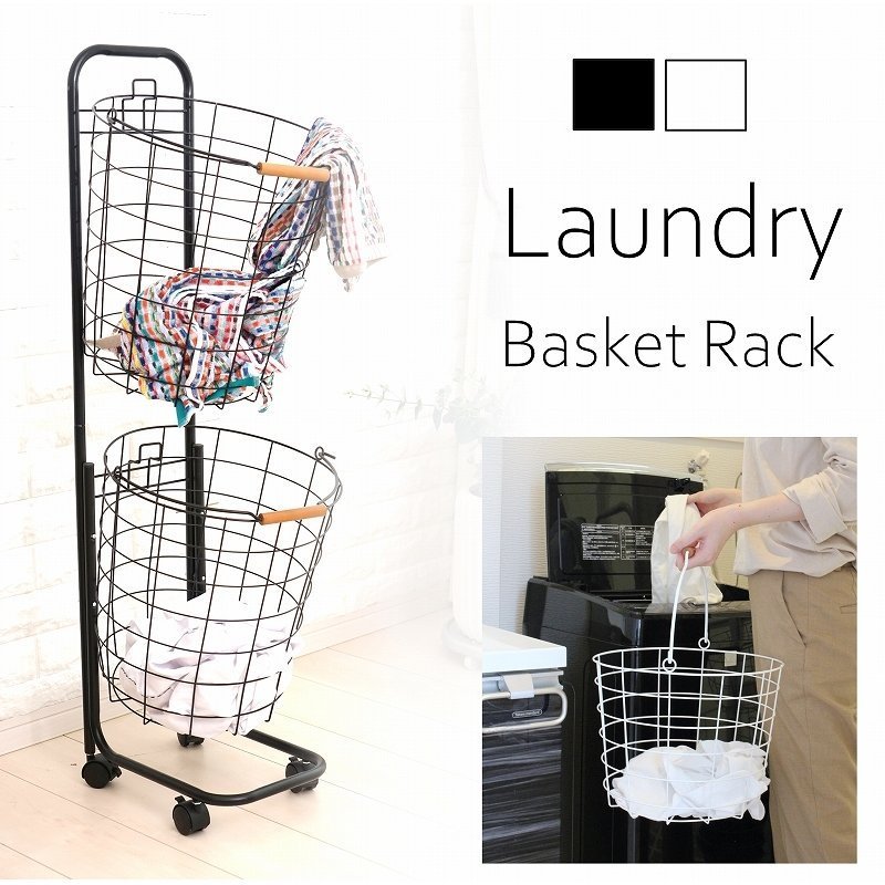 【検索用】 洗濯カゴ おしゃれ ランドリーバスケット 2段 大容量 スリム 一人暮らし シック シンプル キャスター付き ワイヤー メッシュ 白 ホワイト