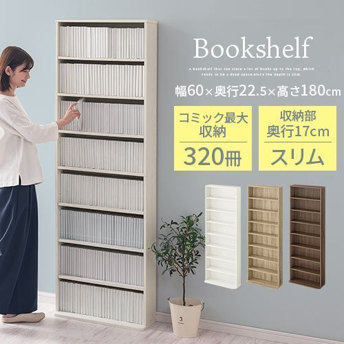 【完成品設置付き】 本棚 薄型 約 側板奥行17cm 奥行22.5 高さ180cm 幅60cm コミックラック シェルフ 大容量 省スペース 漫画 文庫本 可動棚 壁面 木製
