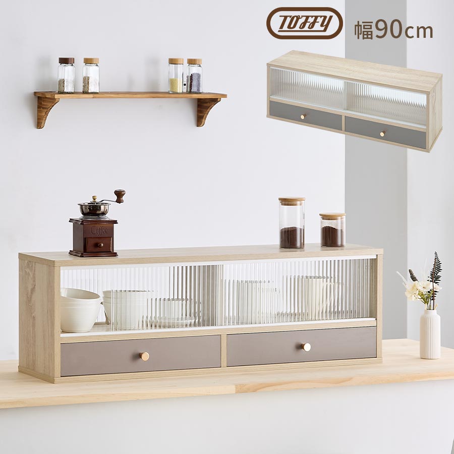 【完成品設置付き】 Toffy トフィー キッチンカウンター上収納 キッチンカウンター 収納 キッチン収納 食器棚 キッチンラック 両面開閉 ガラス 引き戸 引き出し