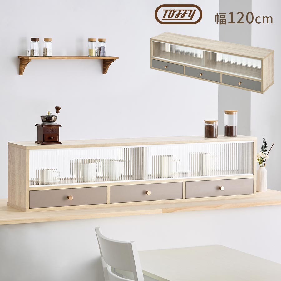 【完成品設置付き】 Toffy トフィー キッチンカウンター上収納 キッチンカウンター 収納 キッチン収納 食器棚 キッチンラック 両面開閉 ガラス 引き戸 引き出し