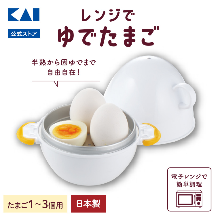 レンジでチンして待つだけで失敗なく、簡単にゆでたまごができます。----------------------------【使用方法】1. 受け容器の水位線まで水を入れます。2. 受け容器に受け皿をセットし、たまごをのせます。3. フタをして両側のストッパーを確実にロックします。4. 取扱説明書に記載の調理時間目安表を参考に電子レンジで加熱します。加熱後、フタをしたまま放置(余熱)します。5. ハンドルを持って容器を取り出します。6. フタを外し、水で冷まします。※電子レンジの機種やたまごのサイズによって多少異なることがあります加熱時間を調整してください。※たまご1〜2個の場合は、加熱時間を30秒程度短縮してください。※700W以上には使用しないでください。---------------------------- ポイント利用 【 爆買 】