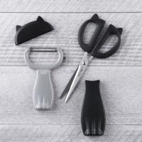 Nyammyシリーズのピーラー、三徳包丁、キッチンハサミ、フルーツナイフ、しゃもじ、スライサー、まな板が一式揃う、7点セットです。自宅用はもちろん、ネコ好きのご家族・ご友人への贈り物にもどうぞ♪