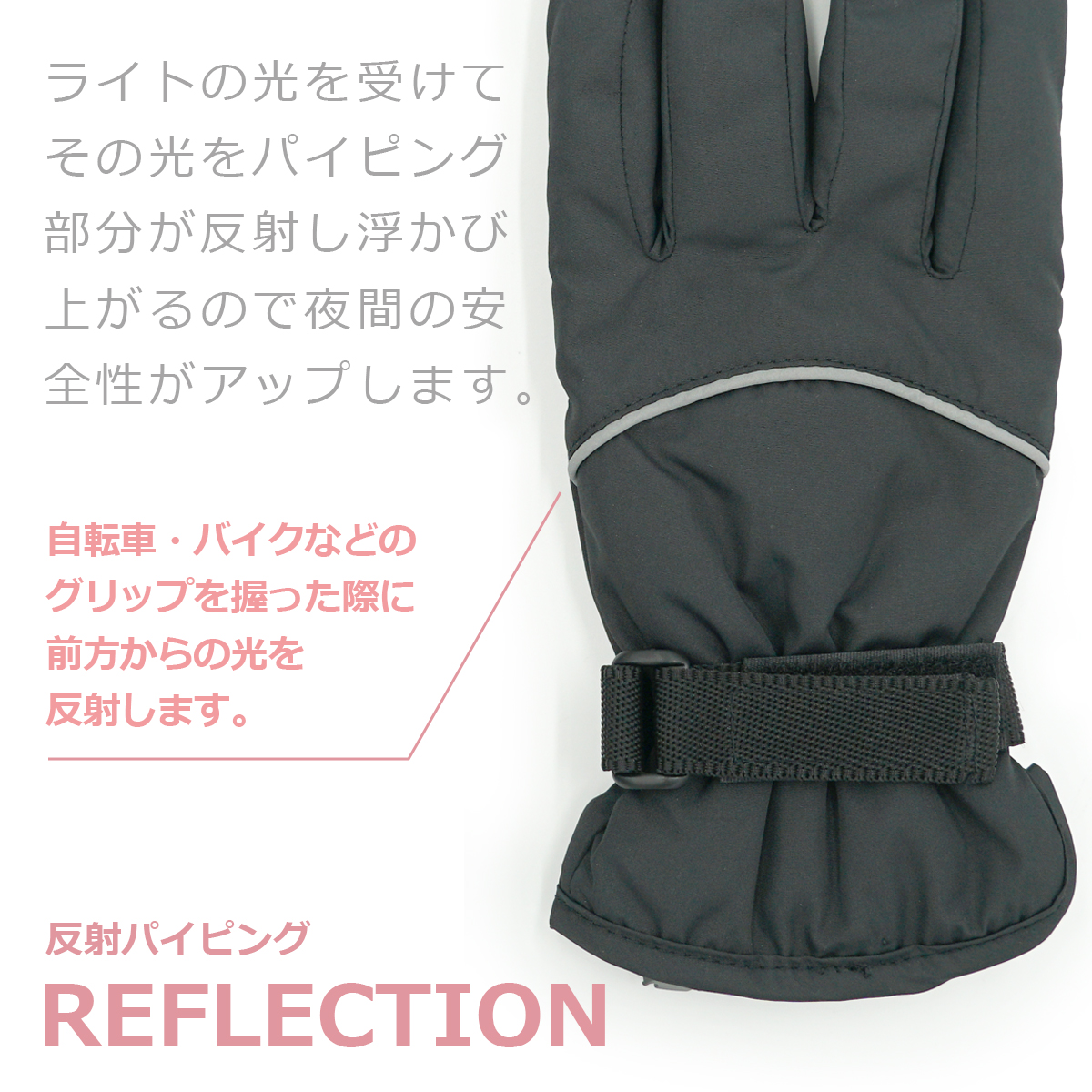ナックル部分に反射パイピンを使用し、自転車、バイクなどのグリップを握った際の視認性性を向上させ、様々な用途に対応します。