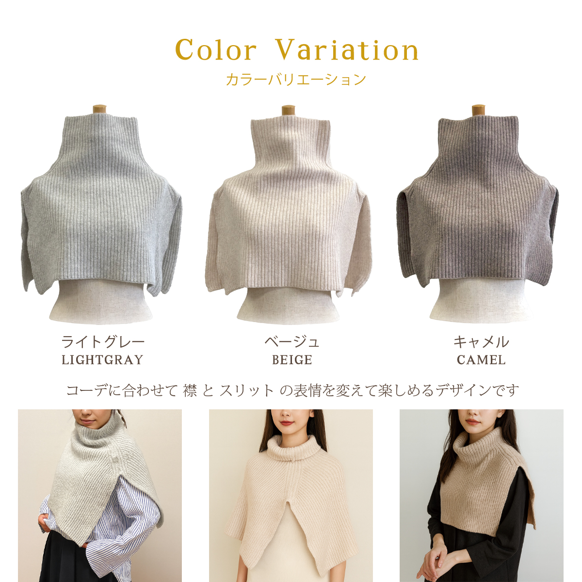 体温を一定に保つやさしいアイテム 首、肩、背中まで暖かくなるウォーマー・柔らかく吸放湿性に優れたウールを100%使用・汗をかいても蒸れずサラリとした着心地・口元まで覆える高めの襟と着やすさを後押しするサイドスリットがアクセント・スタンドカラーでカジュアルに、襟を内側に折り返してモードに、コーデに合わせてカスタム・自然素材の風合いを楽しめます・プレゼントにも