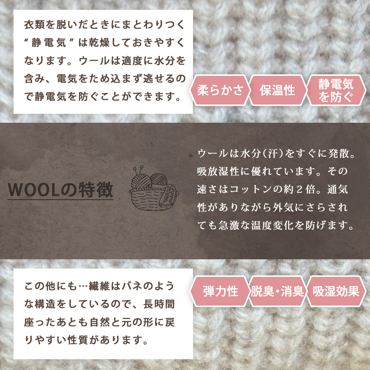 乾燥してパチパチッとくる静電気を抑えつつ快適にご愛用いただくために、ナイロン、シルク、レーヨン、コットンの衣類と合わせたり洗濯時に柔軟剤を使うと静電気は発生しにくくなります。