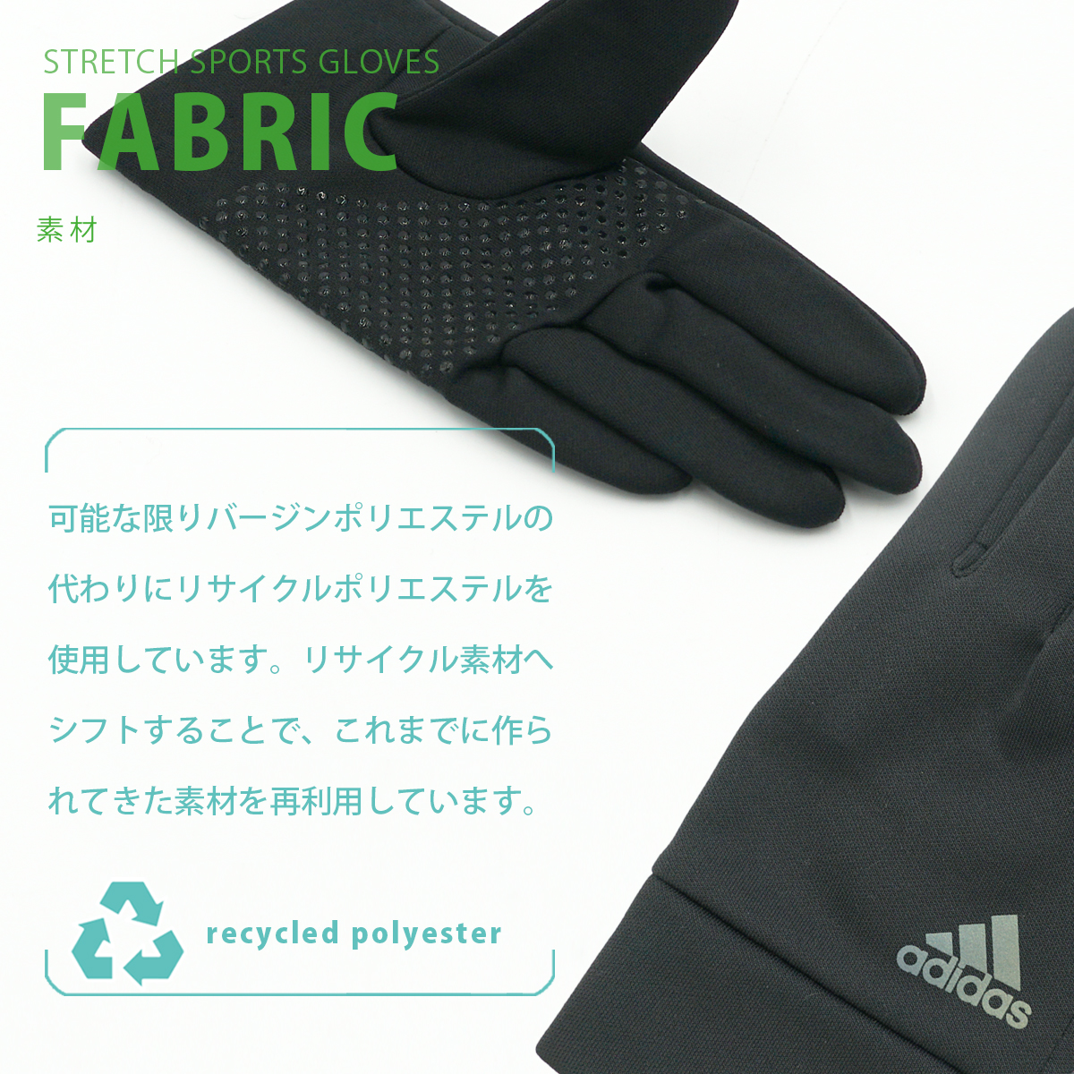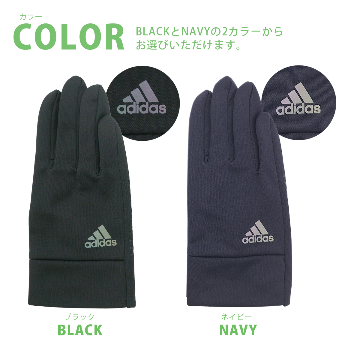 ・伸縮性のある素材でフィットしやすく着脱しやすい・すべり止め付きでグリップ性を高めます。スポーツにアウトドア、自転車などにお使いいただけます・中面は蓄熱保温性のあるフリースを使用。冷たい空気から手肌を守ります・ホログラムのように光の加減や角度により色の変わるadidasのロゴが印象的です