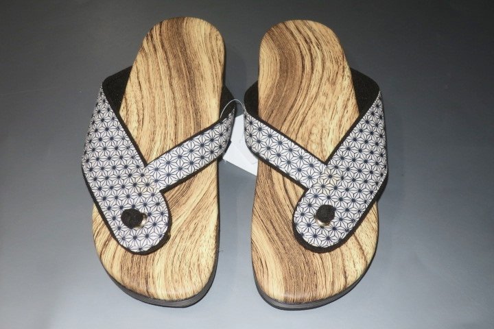 こちらは、下駄サンダルです。T字の鼻緒は足と接する部分をネル生地を採用、足の親指と人差し指に当たる部分はビニールチューブで覆い、足の裏と接する部分は木目プリントです。素材は軽くて弾力性のあるポリウレタン製で、裏には滑りにくく削れにくい硬質ゴムを貼っています。傷みにくく、履き心地も優しいサンダルです。