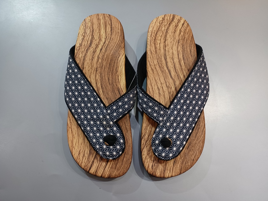 こちらは、下駄サンダルです。T字の鼻緒は足と接する部分をネル生地を採用、足の親指と人差し指に当たる部分はビニールチューブで覆い、足の裏と接する部分は木目プリントです。素材は軽くて弾力性のあるポリウレタン製で、裏には滑りにくく削れにくい硬質ゴムを貼っています。傷みにくく、履き心地も優しいサンダルです。