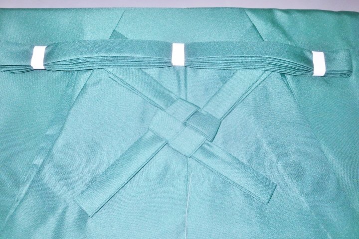 本体の色は水浅葱色の無地で、織感はふわっとしたお召調です。仙台平のような突っ張るような生地ではありません。緑系は色味が難しいため現物優先でお願いします。