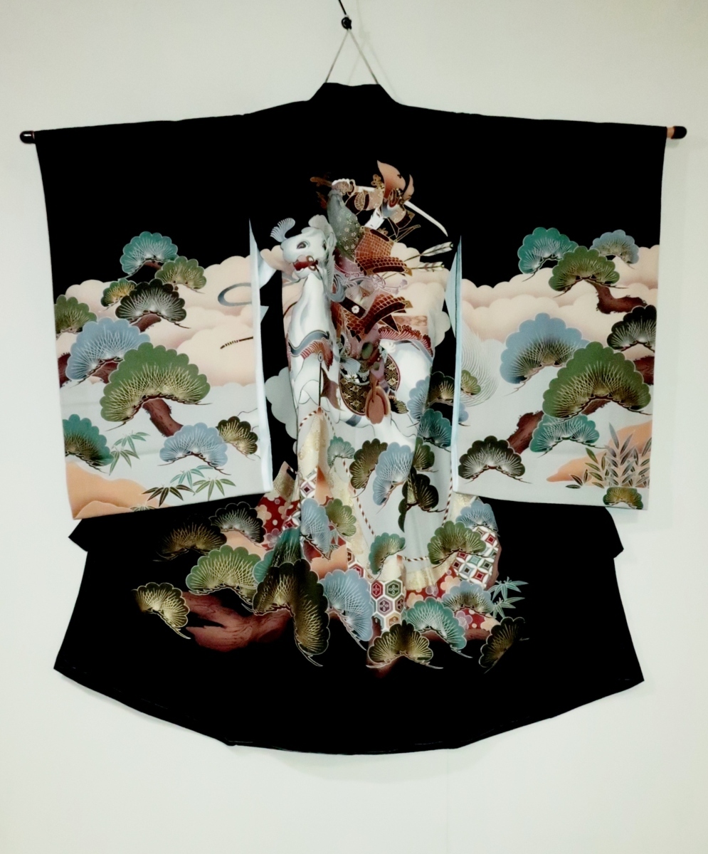 弐7029R 本絹羽二重熨斗目 男子お宮参り着物К紺地白馬の若武者 紋入れ代込