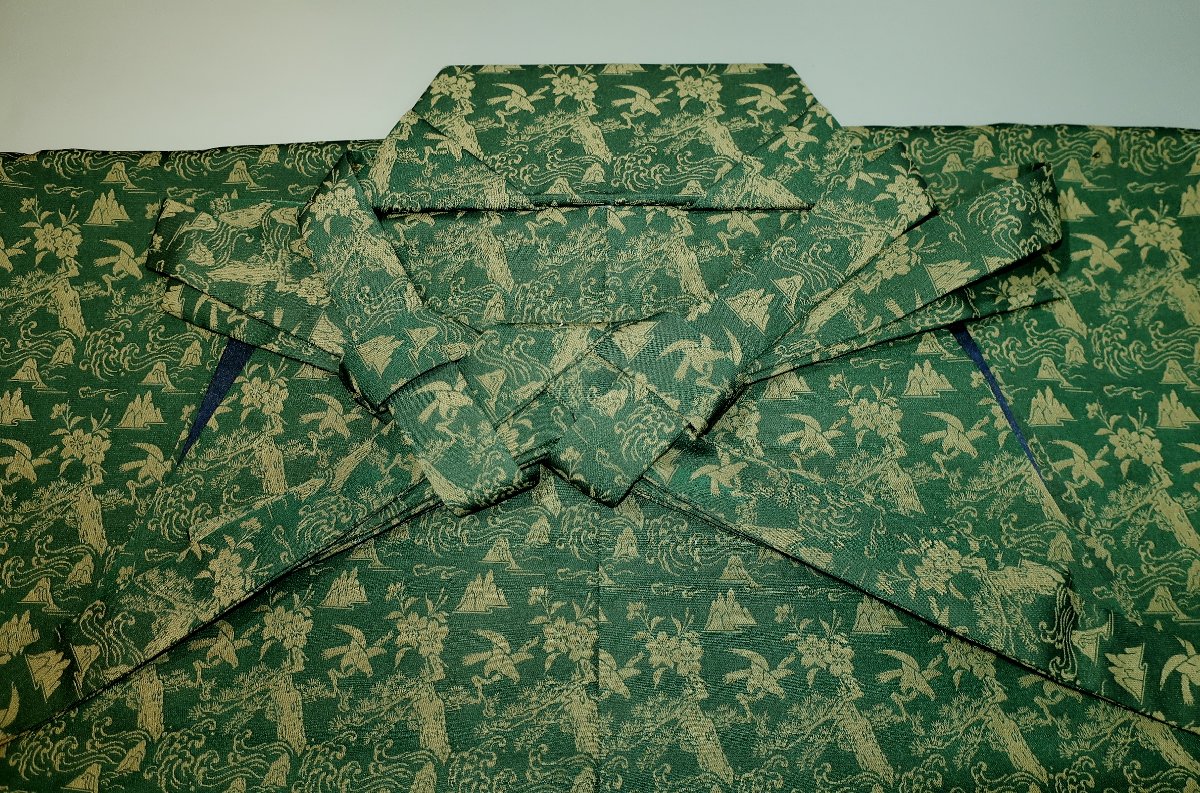 こちらのお品は、本絹米澤平馬乗袴です。色柄は深緑に金色の桃源郷文様です。色味が難しいため現物優先でお願いします。無双仕立てで柔らかい織です。