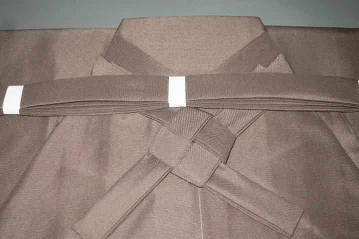 茶道・弓道などの稽古に如何ですか。こちらのお品は別誂えでお願いしたお召調の馬乗袴です。最大の特長は、弓道では跪座から立ったとき、茶道では正座から立ち上がったときに、裾や膝裏がシワになりにくストンと床に落ちやすい生地を使いました。弊社特注の新品です。本体はポリエステル100%、腰板は化繊の不織布を板状に伸したもので硬すぎず柔らかすぎないしっかりした感触で、オール化繊ですから家庭で洗濯も可能です。不織布といっても紙状のものではなく固形化したものです。本体の色は灰茶胡桃色の無地。織感はふわっとしたお召調です。仙台平のような突っ張るような生地ではありません。サイズ違いも出ています。腰板にヘラも着いています。縫製は国内職人の監修による中国縫製の品です。今まで袴に苦慮していた方は如何でしょうか。