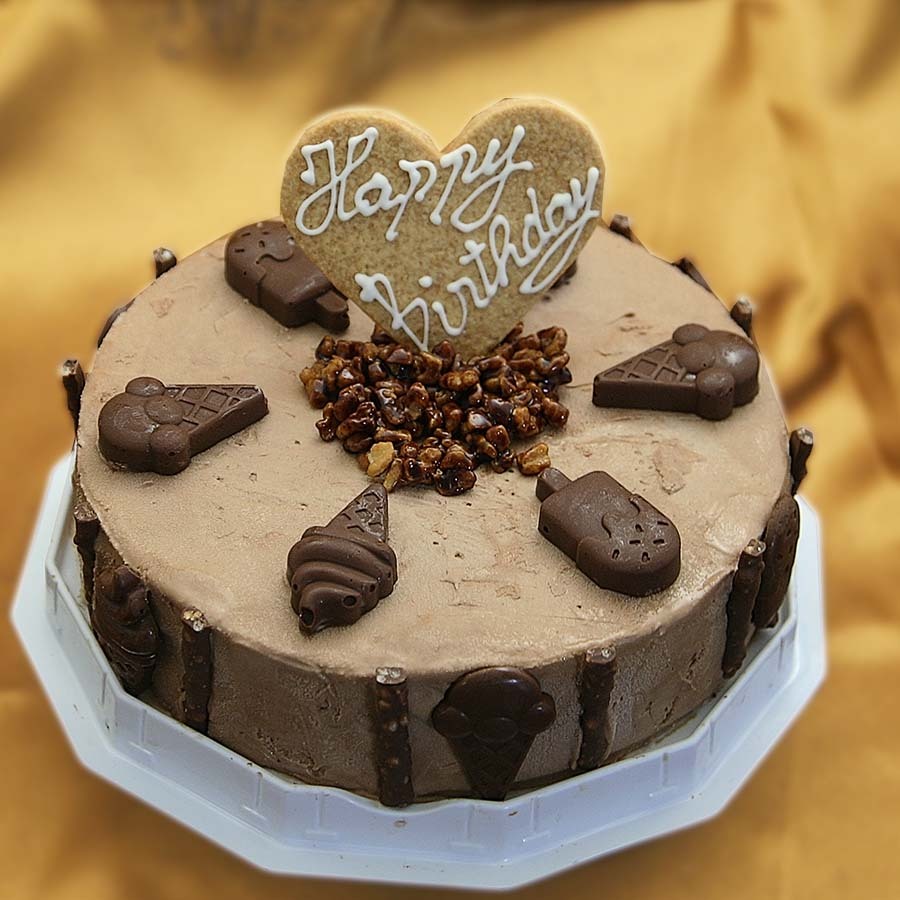 チョコレートアイスケーキ 6号(お誕生日ギフトアイスケーキ) このアイスクームケーキは6号、18cmサイズで、通常の5号に比べ少し大きめ。味もシンプルで、チョコレートの深い味が楽しめます。上に載せたのはチョコレートでコーティングしたクルミです。?
