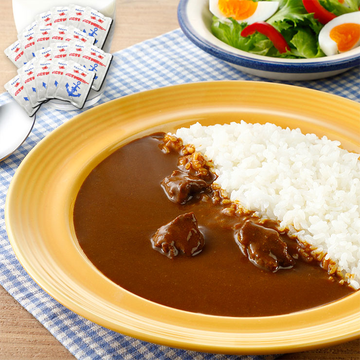 ■原材料:牛肉(国産、オーストラリア産)、小麦粉、食用油脂(豚脂)、砂糖、しょうゆ、カレー粉、ソテーオニオン、乳等を主要原料とする食品、チャツネ、野菜(にんにく、しょうが、にんじん、じゃがいも)、ビーフエキス、りんごピューレ、砂糖・ぶどう糖果糖液糖、トマトペースト、食塩、脱脂粉乳、ゼラチン、香辛料/調味料(アミノ酸)、カラメル色素、酸味料、香料、(一部に小麦・卵・乳成分・牛肉・大豆・バナナ・豚肉・りんご・ゼラチンを含む)
