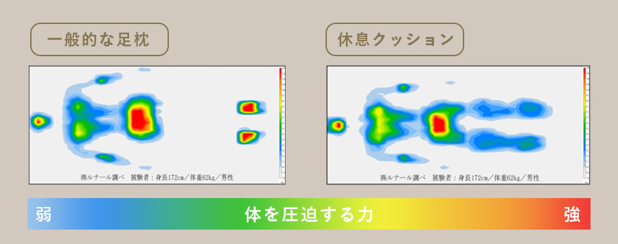 一般的な足枕が、お尻・ふくらはぎに圧力がかかっているのに対し、休息クッションは圧力が分散しているのがわかります。