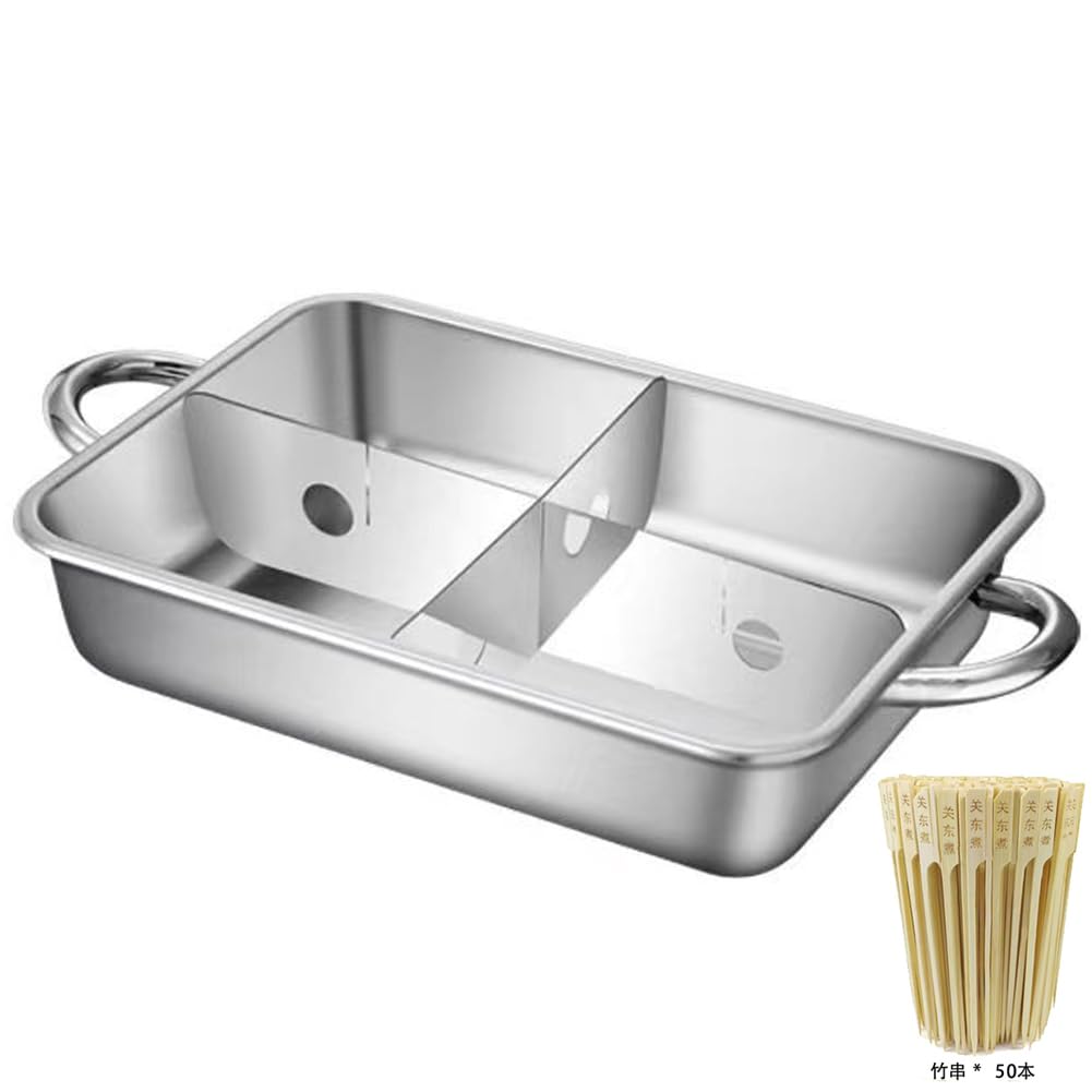 おでん鍋 IH対応 角 仕切り鍋 業務用 家庭用 両手鍋 4グリッド ステンレス鋼 中華火鍋 卓上鍋 直火対応 仕切り付 関東煮 しゃぶしゃぶ鍋 竹串50本付き
