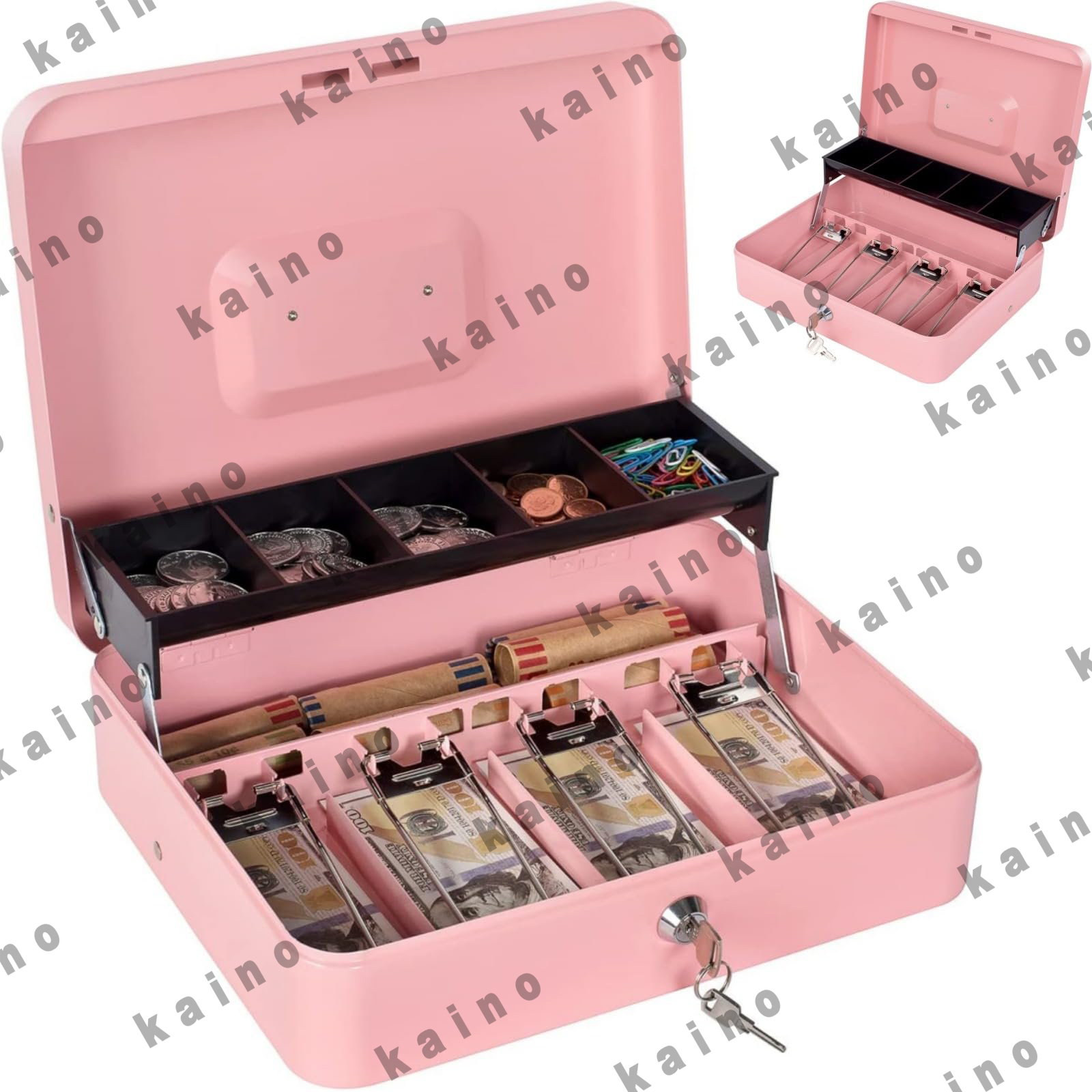 カンチレバーマネートレイ: キャッシュボックスが開くと、コイン用の5つのコンパートメントカンチレバートレイが自動的に開きます。金庫 家庭用の下には、追加の紙幣、メモ、領収書などを入れるための小さなコンパートメントがあります。