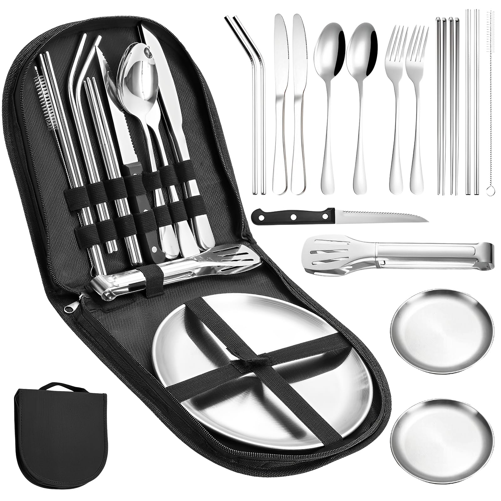 【アウトドアカトラリーセット】17点セット(フォーク2本、スプーン2本、ナイフ2本、皿2枚、ステーキナイフ1本、ステーキクリップ1本、箸2本、ストロー4本、ストローブラシ1本、収納袋1個) 総重量:約900g。