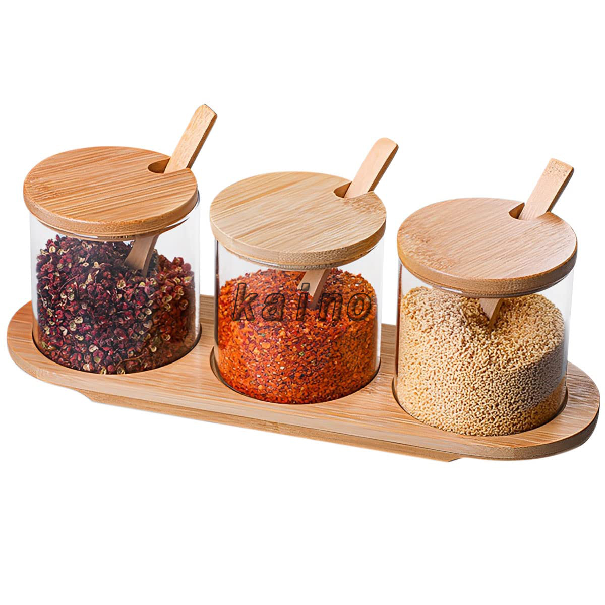調味料入れ 調味料ポット スパイスボトル 3個セット 竹カバー トレーとスプーン付き ガラス製 おしゃれ 砂糖 塩入れ 湿気防止