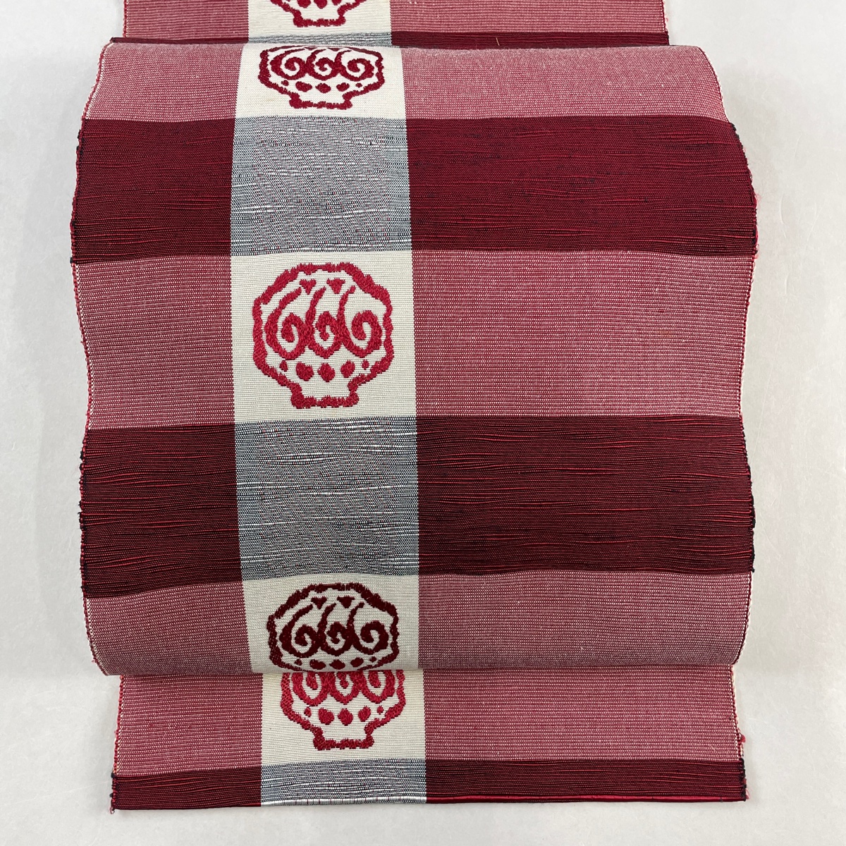 名古屋帯 優品 縞 幾何学 赤 正絹 中古 在庫一掃