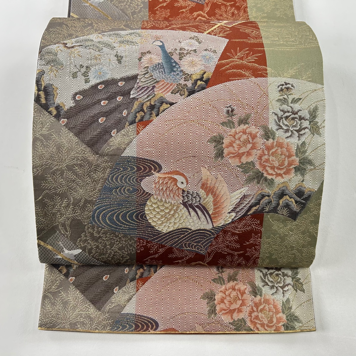 袋帯 美品 秀品 関西仕立て 鴛鴦 扇面 金糸 箔 赤茶 六通 正絹 中古 在庫一掃