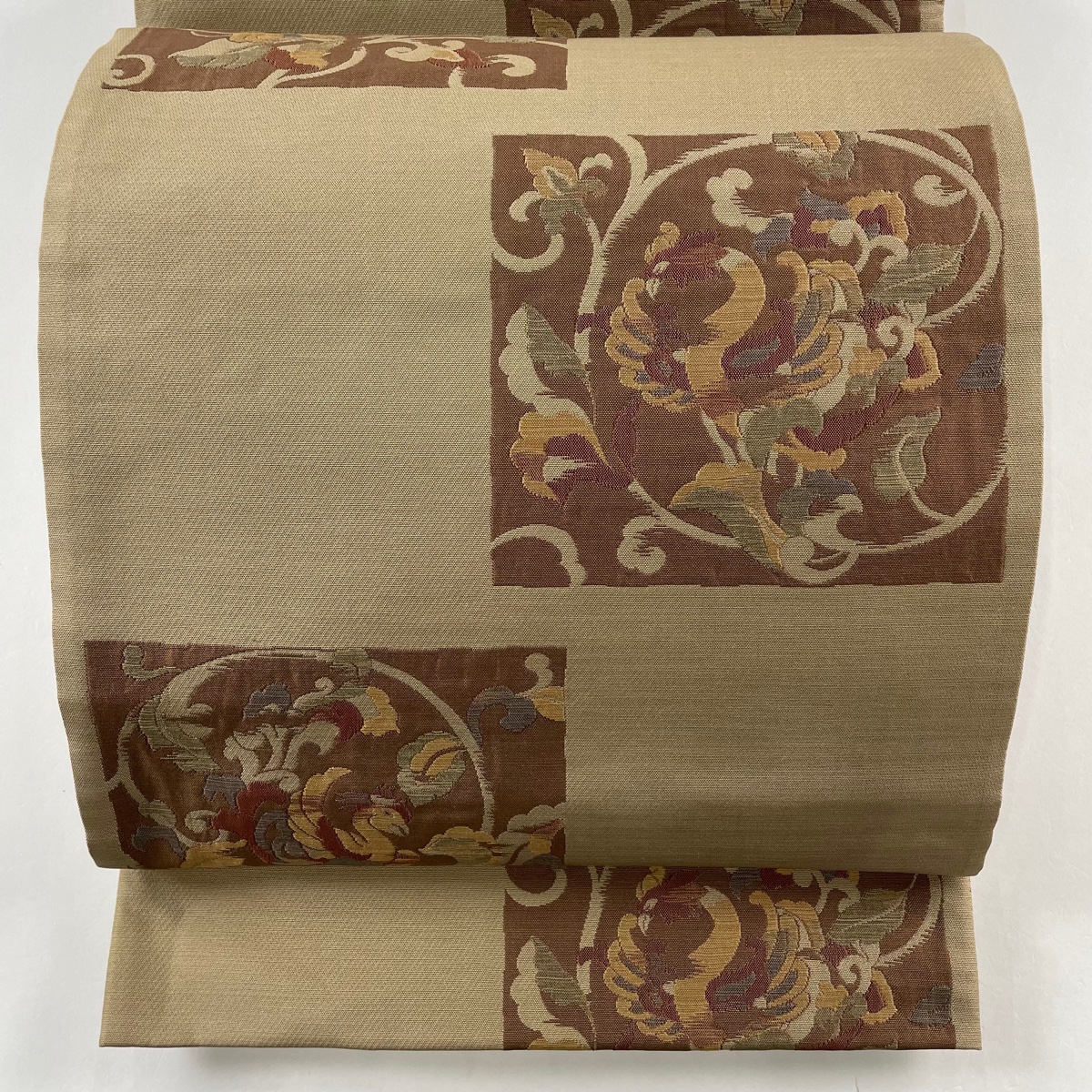 袋帯 秀品 鳥 唐草 薄茶色 六通 正絹 中古 在庫一掃