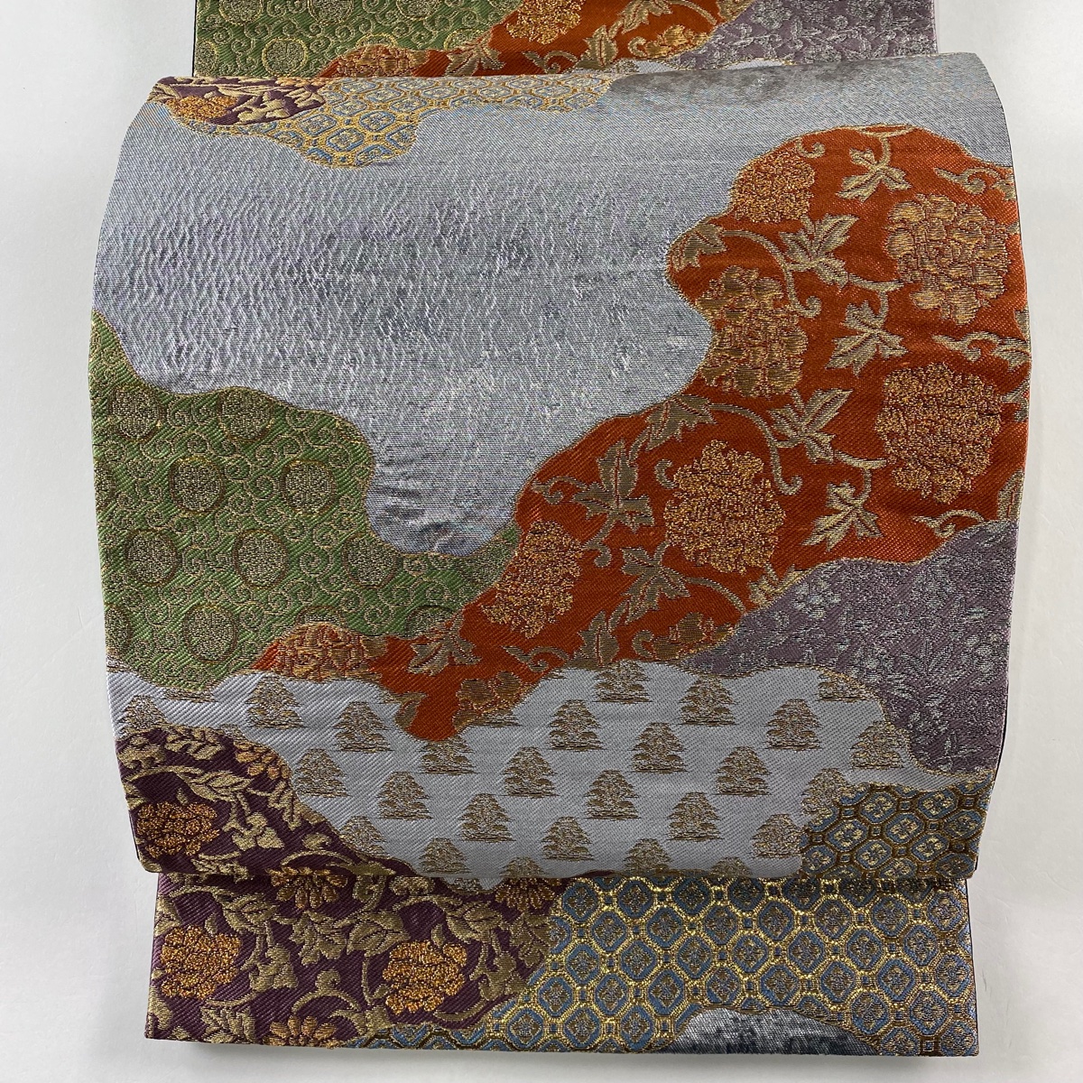 袋帯 美品 秀品 鈴乃屋 花唐草 花菱 金銀糸 箔 銀色 六通 正絹 中古 在庫一掃