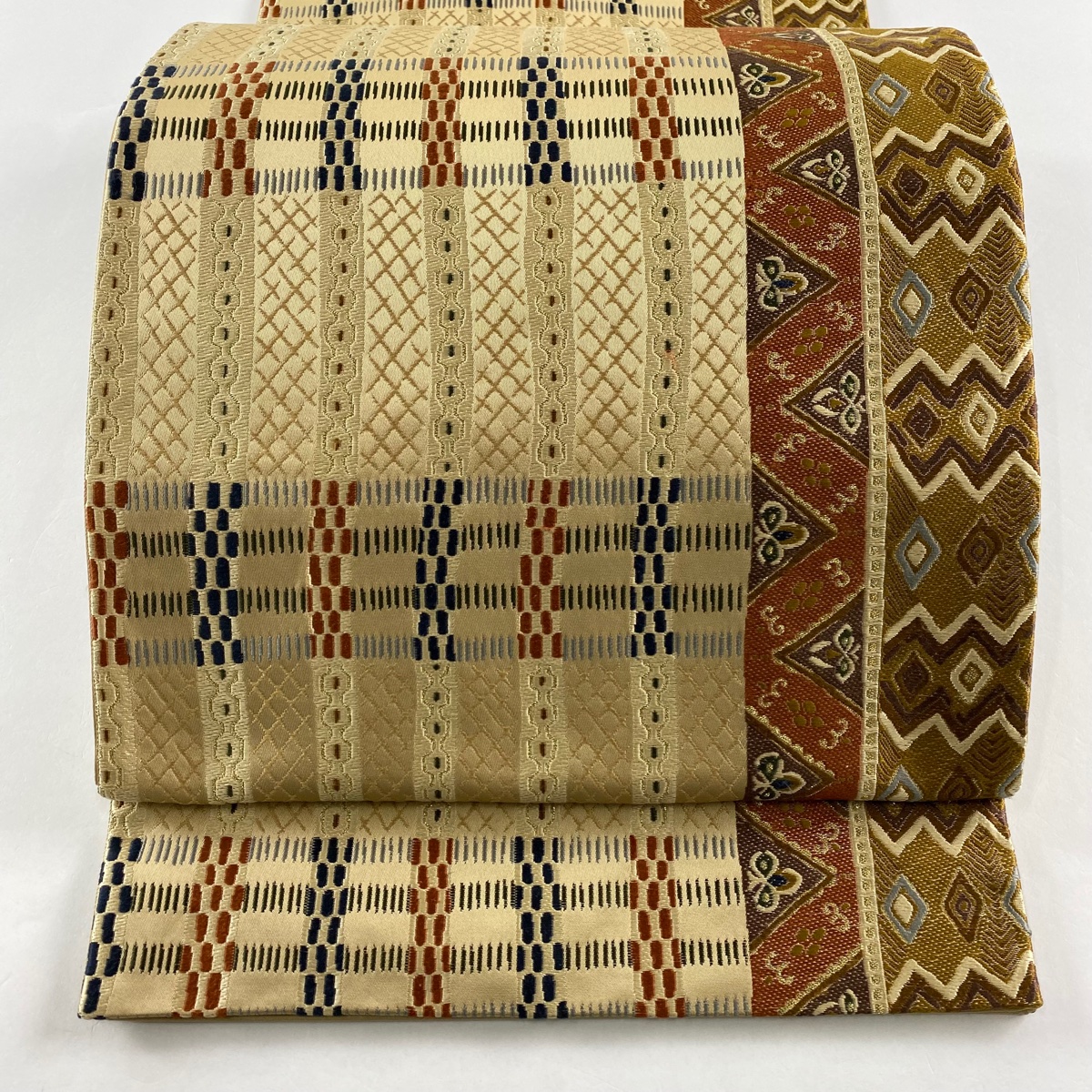 袋帯 美品 秀品 縞 幾何学模様 金糸 ベージュ 六通 正絹 中古 在庫一掃