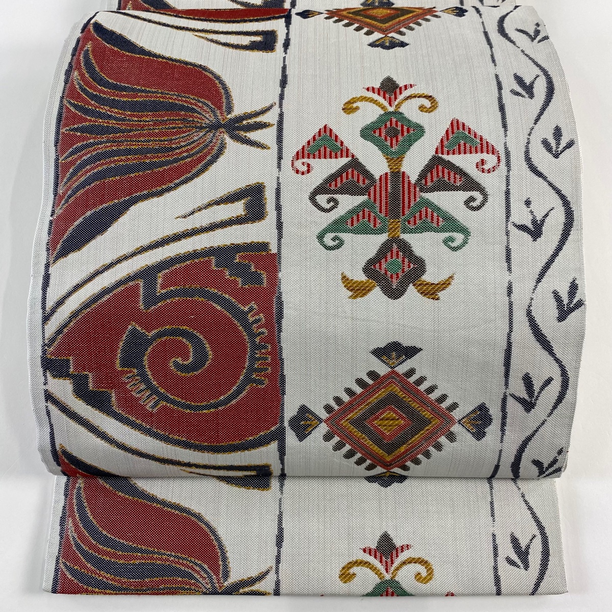 袋帯 秀品 草花 菱文 灰白 六通 正絹 中古 在庫一掃