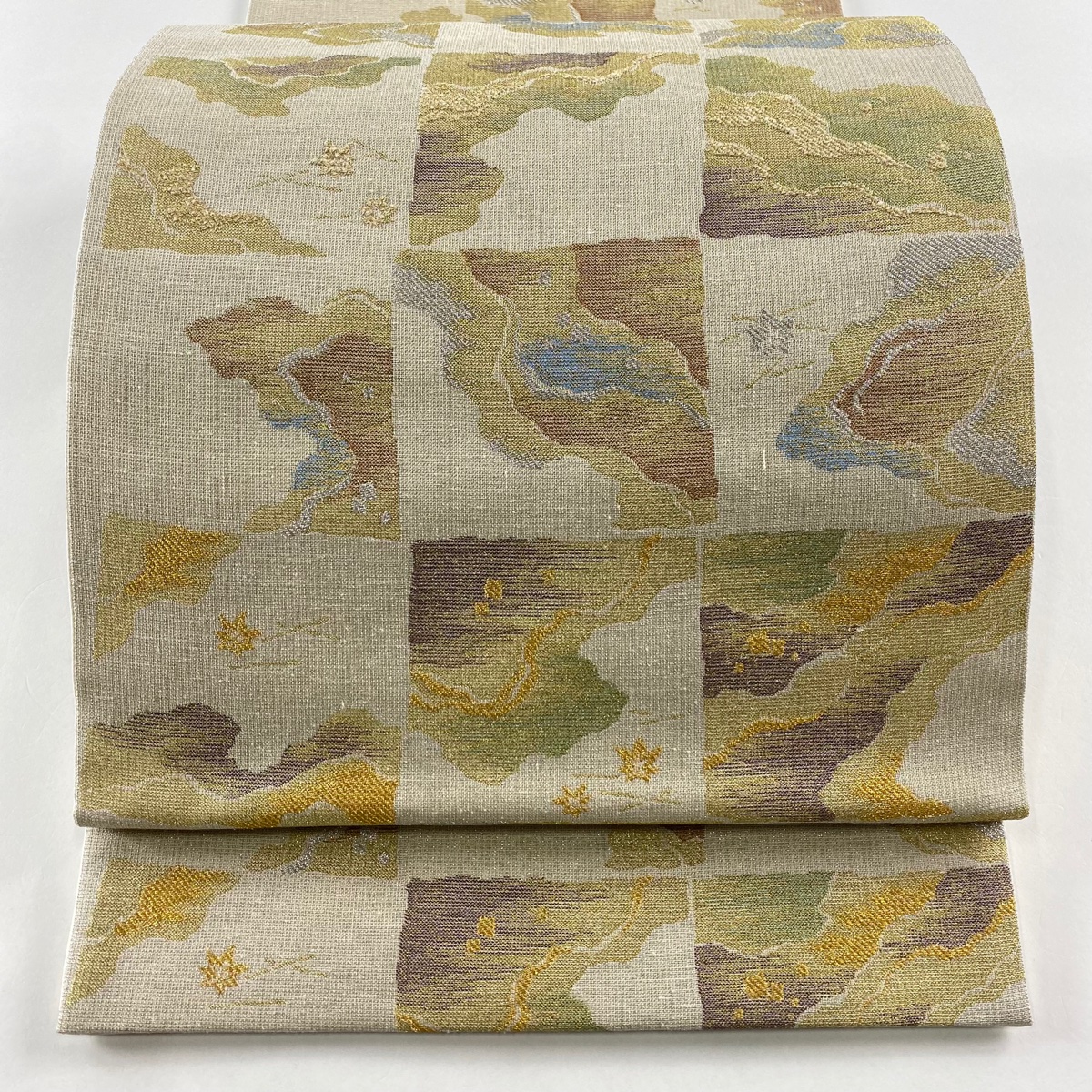 袋帯 美品 秀品 霞 幾何学模様 金銀糸 ベージュ 六通 正絹 中古 在庫一掃