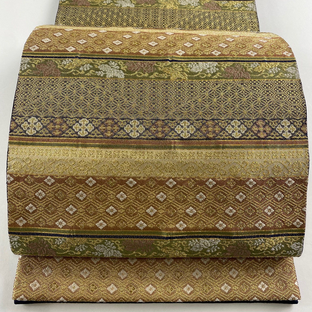 袋帯 美品 秀品 段縞 花菱 金銀糸 金色 六通 正絹 中古 在庫一掃