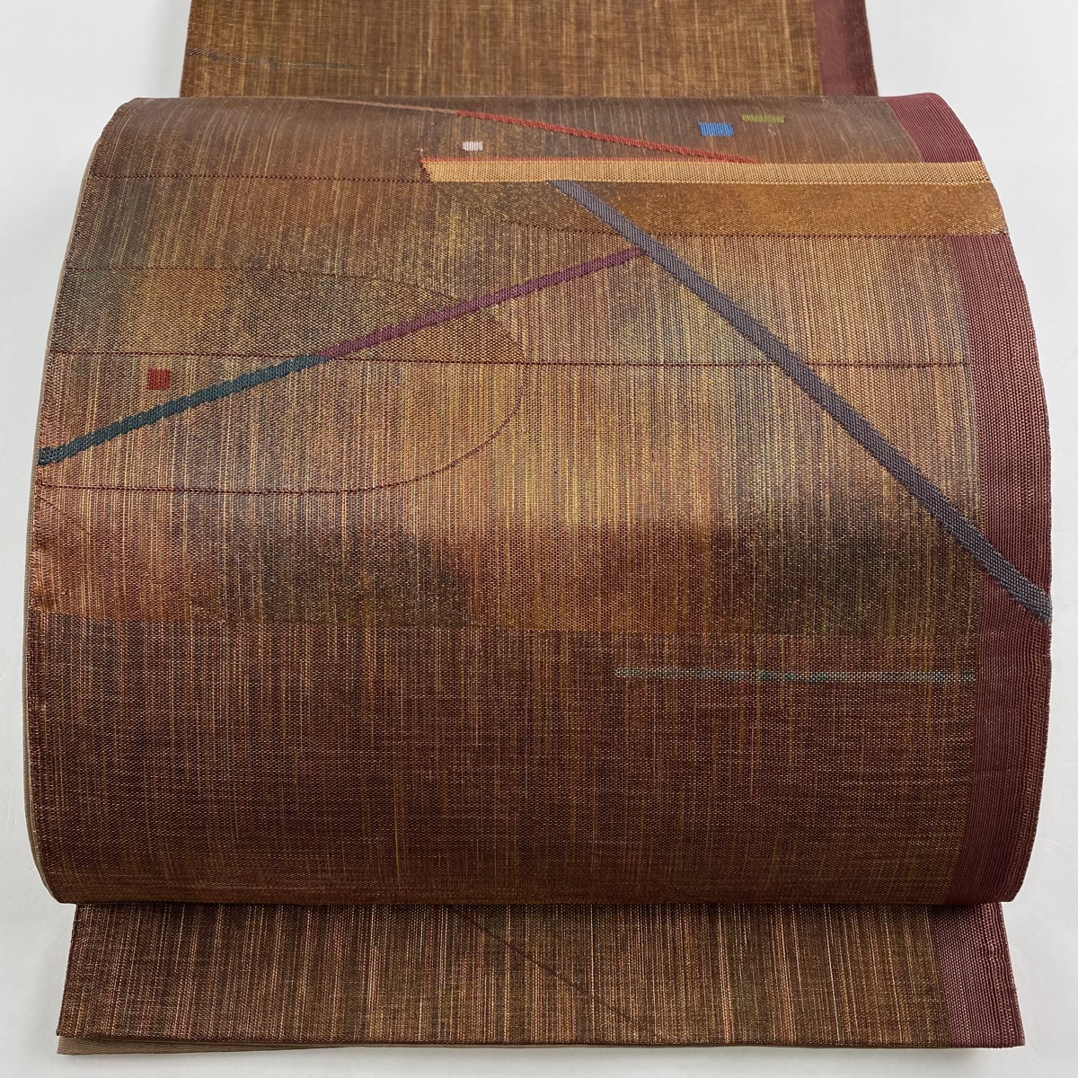 袋帯 美品 秀品 幾何学 金糸 箔 茶色 お太鼓柄 正絹 中古 在庫一掃
