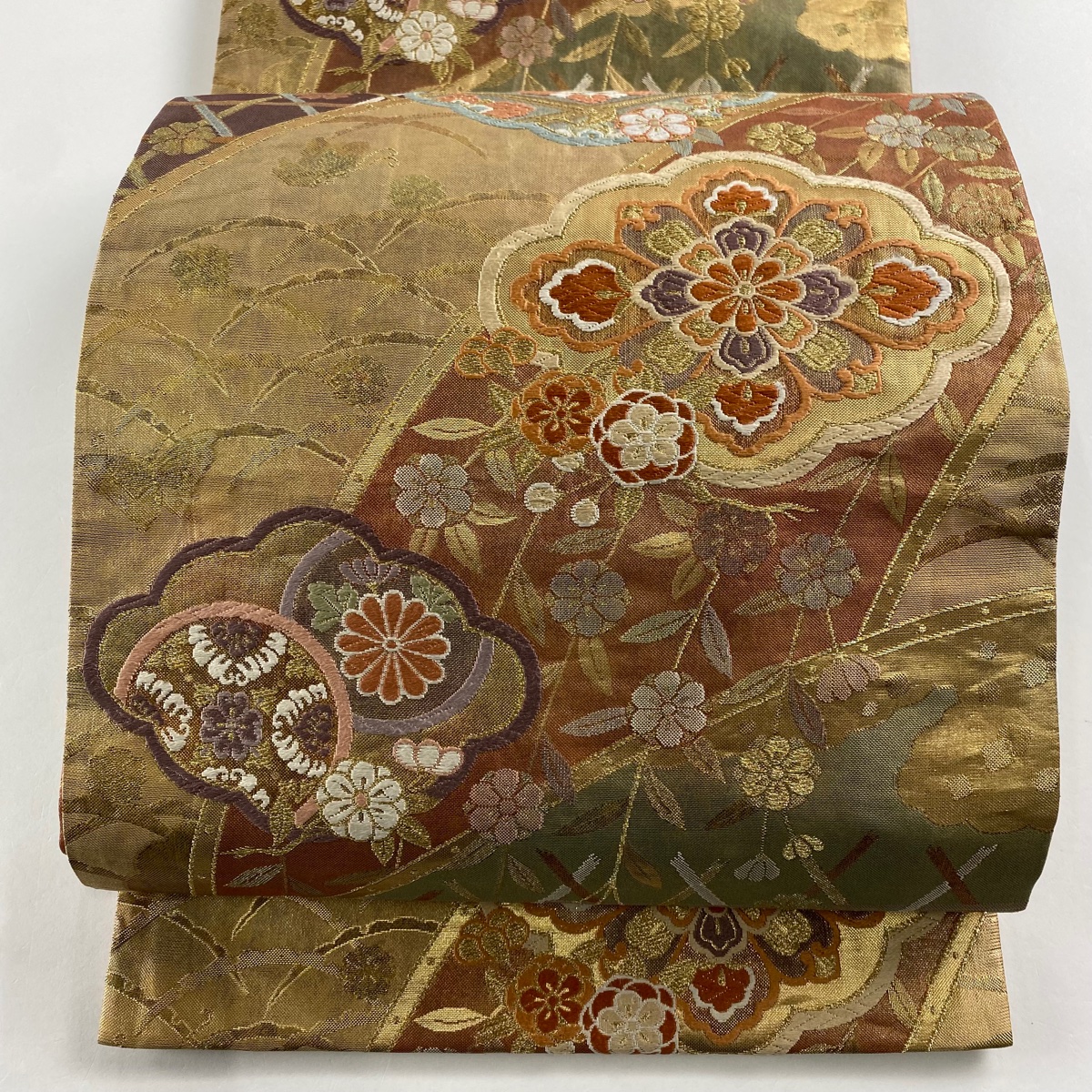 袋帯 秀品 華文 草花 唐織 箔 金色 六通 正絹 中古 在庫一掃