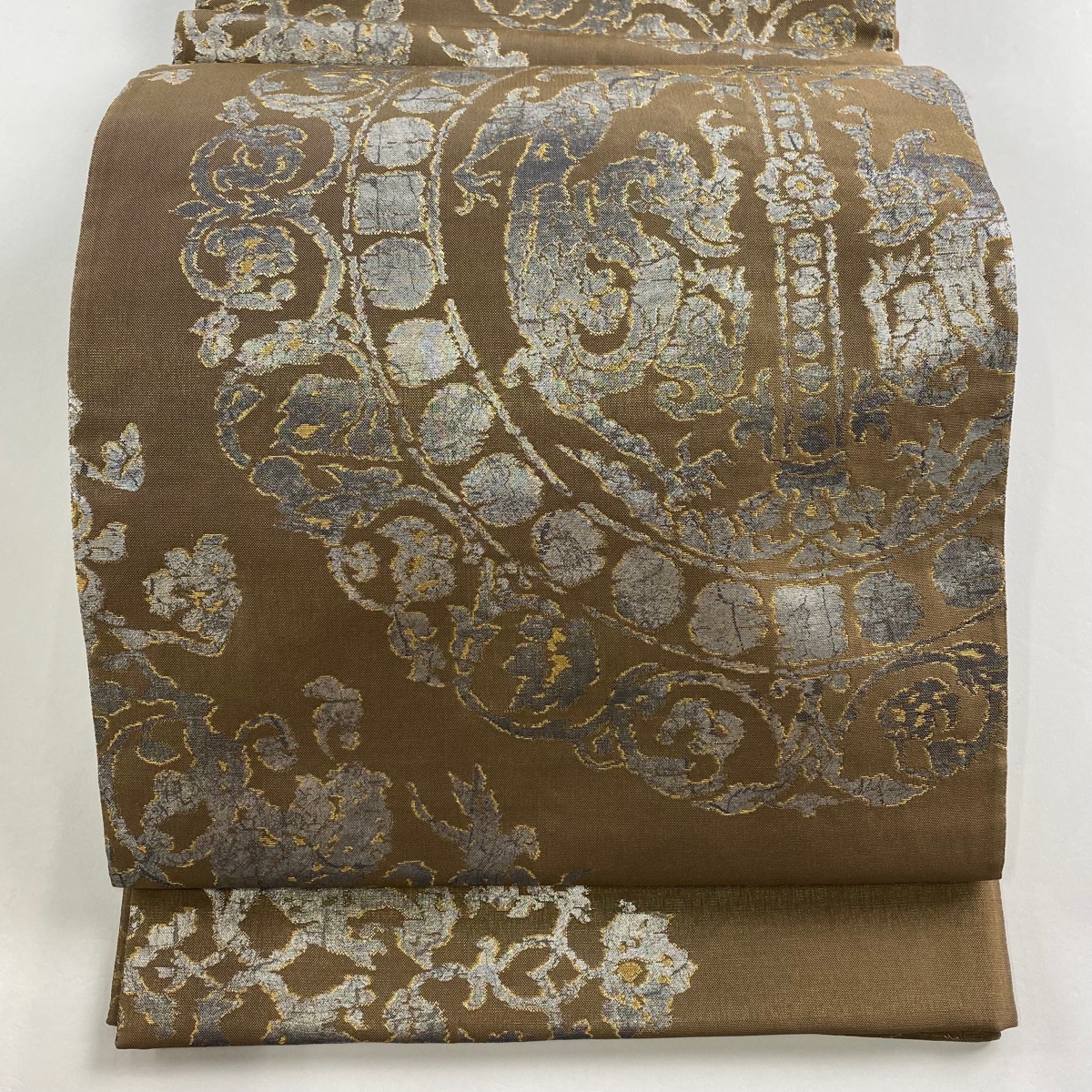 袋帯 秀品 連珠文 樹下鳥獣文 箔 金糸 焦茶色 六通 正絹 中古 在庫一掃