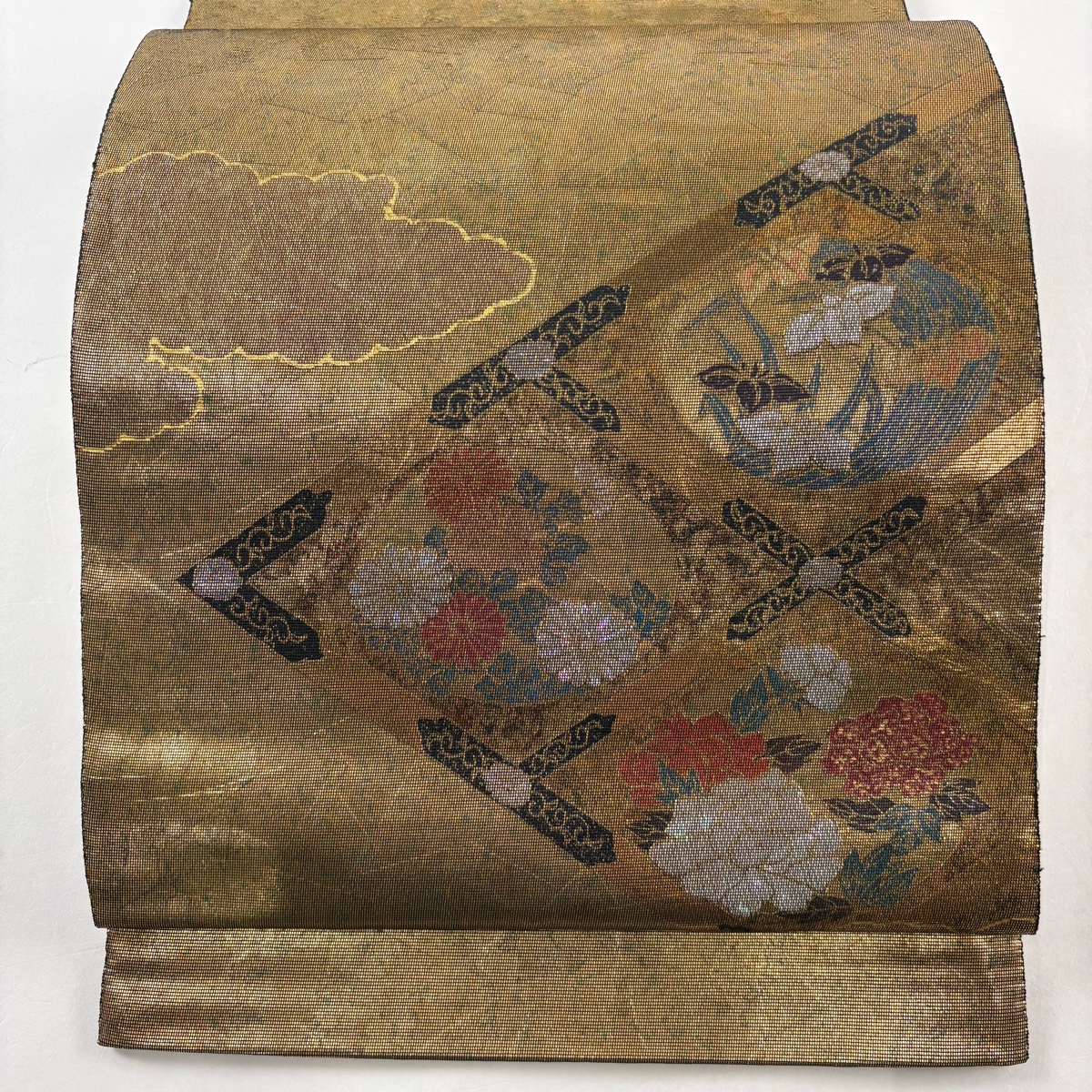 袋帯 美品 秀品 草花 菱天井 螺鈿 箔 金色 お太鼓柄 正絹 中古 在庫一掃