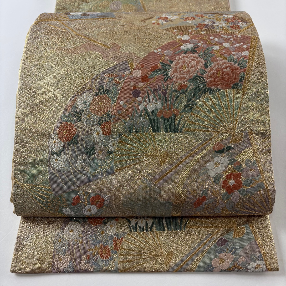 袋帯 秀品 扇 草花 箔 金糸 金色 全通 正絹 中古 在庫一掃