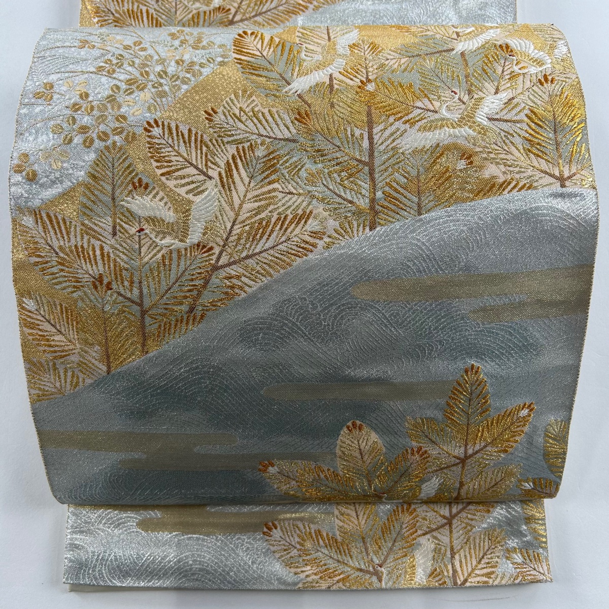 袋帯 秀品 関西仕立て 飛鶴名直文 金糸 箔 銀色 六通 正絹 中古 在庫一掃