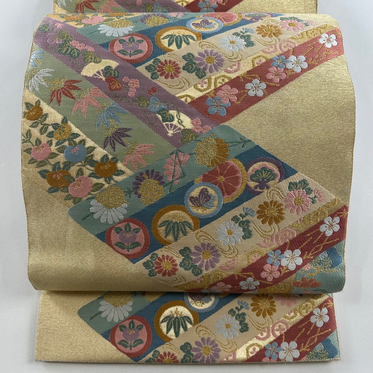 袋帯 美品 秀品 松竹梅 菊 金糸 刺繍 金色 六通 正絹 中古 在庫一掃