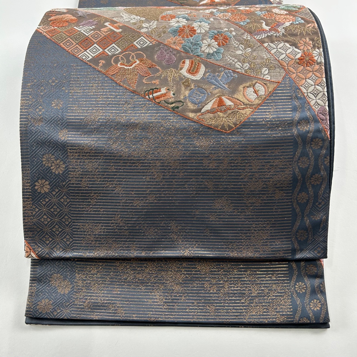 袋帯 美品 秀品 慶長小袖文 松竹梅 刺繍 金糸 青灰色 全通 正絹 中古 在庫一掃