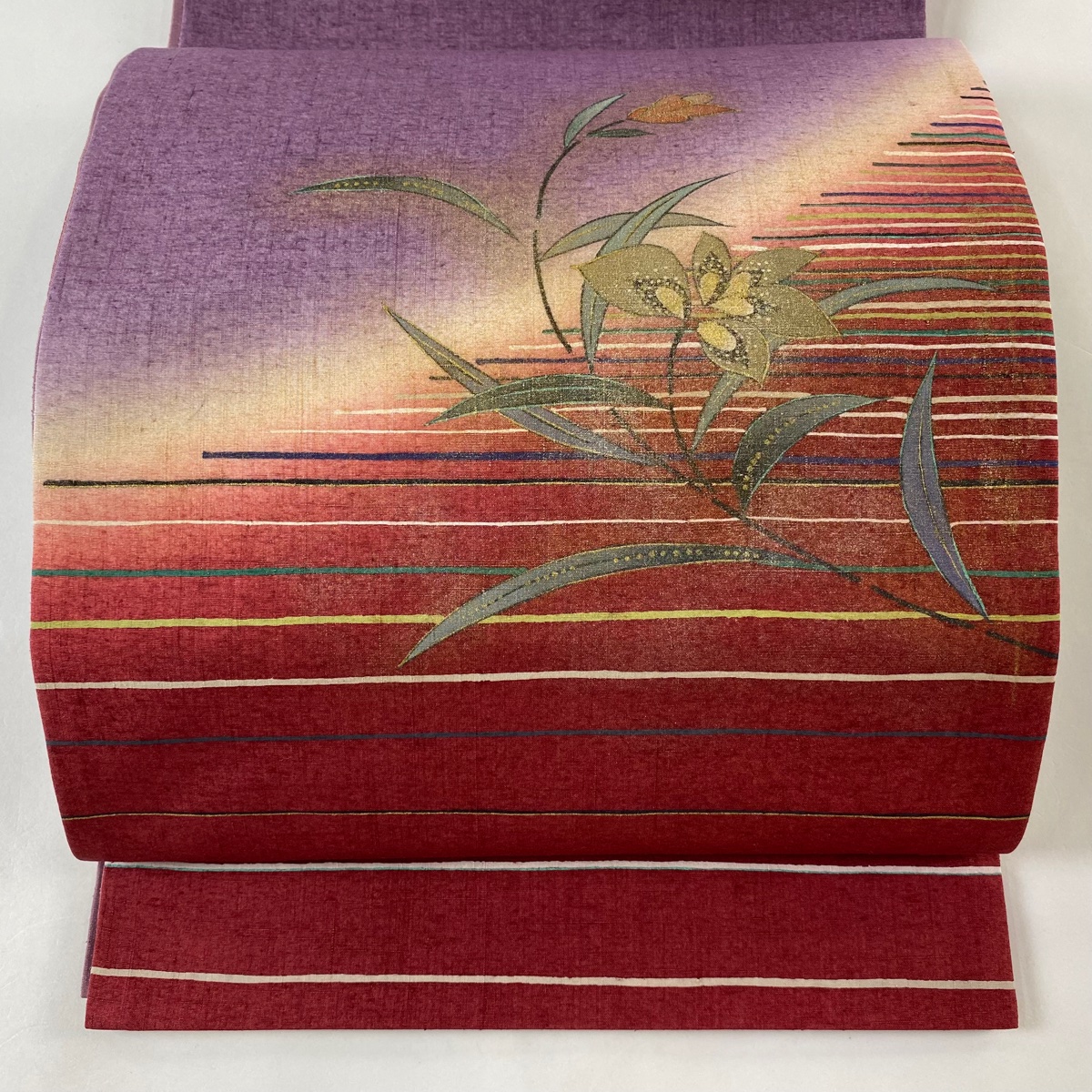 袋帯 秀品 紬地 草花 縞縞 金銀彩 えんじ色 お太鼓柄 正絹 中古 在庫一掃