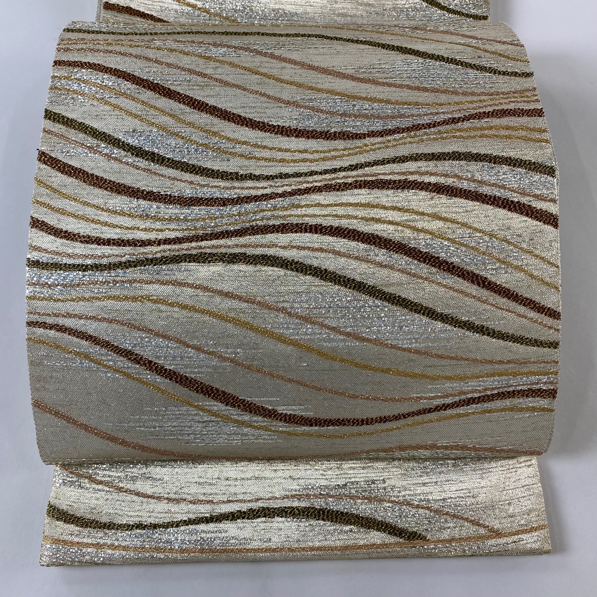 袋帯 秀品 よろけ縞 金糸 箔 ベージュ 六通 正絹 中古 在庫一掃
