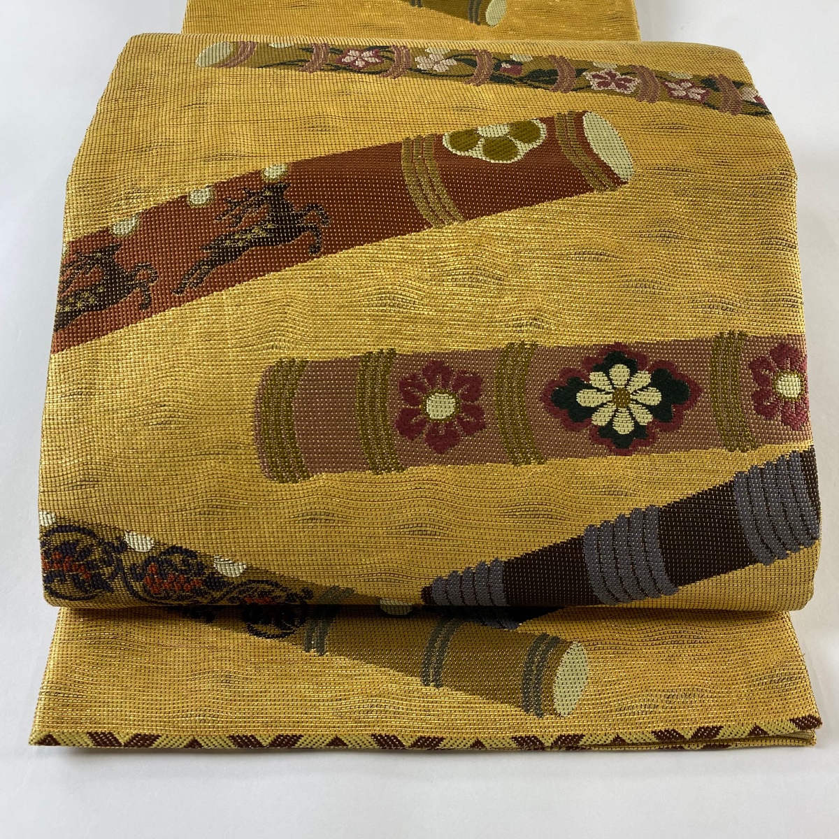 袋帯 美品 秀品 笛 鹿 金糸 箔 黄土色 六通 正絹 中古 在庫一掃