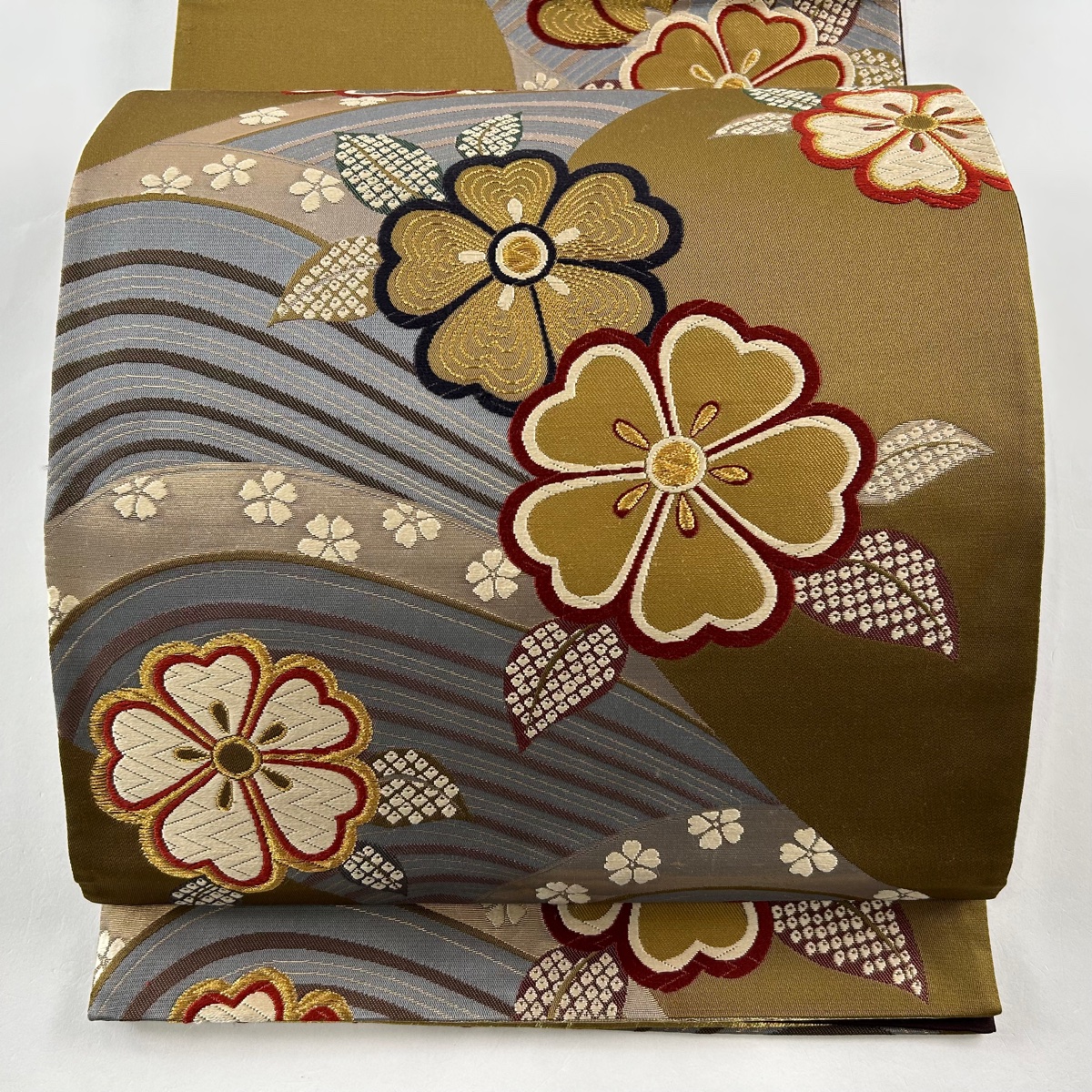 袋帯 秀品 波 桜 金糸 箔 茶緑色 六通 正絹 中古 在庫一掃