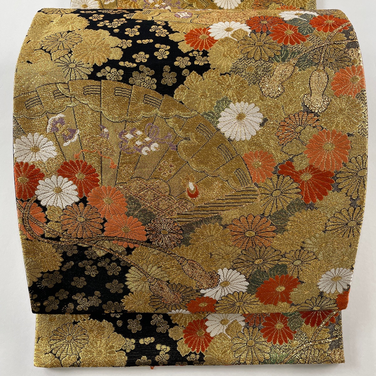 袋帯 美品 秀品 檜扇 菊 金糸 箔 金色 六通 正絹 中古 在庫一掃